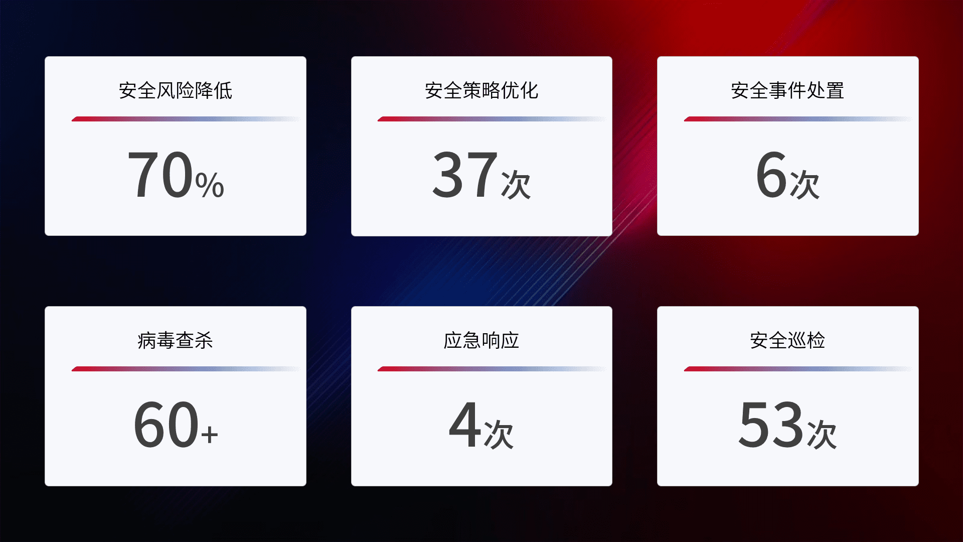 提供全面的安全事件报告体系,,包括处置报告、、、周报、、、、季度和年度总结,,结合持续监控,,帮助客户深入了解网络安全状况。。。。